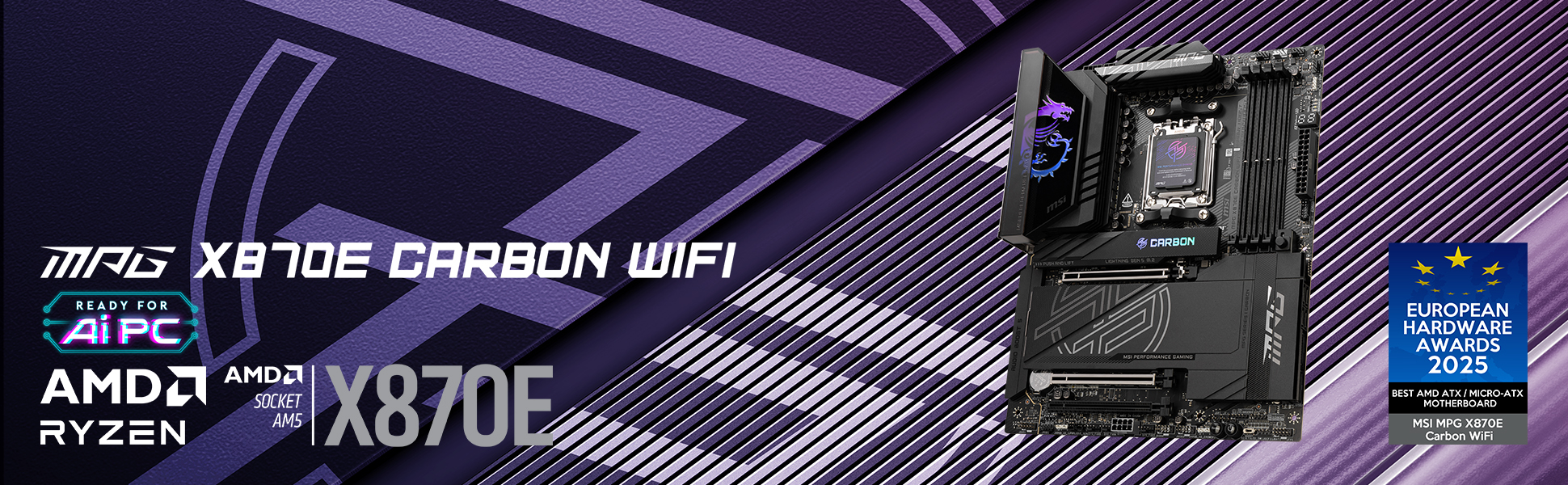 MSI MPG X870E CARBON WIFI è una scheda madre ATX orientata al gaming, dotata di un sistema di alimentazione a 18 Duet Rail, costruita attorno all'ultimo chipset AMD X870E, compatibile con i processori desktop AMD Ryzen serie 9000 / 8000 / 7000. Include PCIe 5.0, LAN 5G, Wi-Fi 7, DDR5 e un design premium Frozr, che garantisce sia prestazioni che stile.